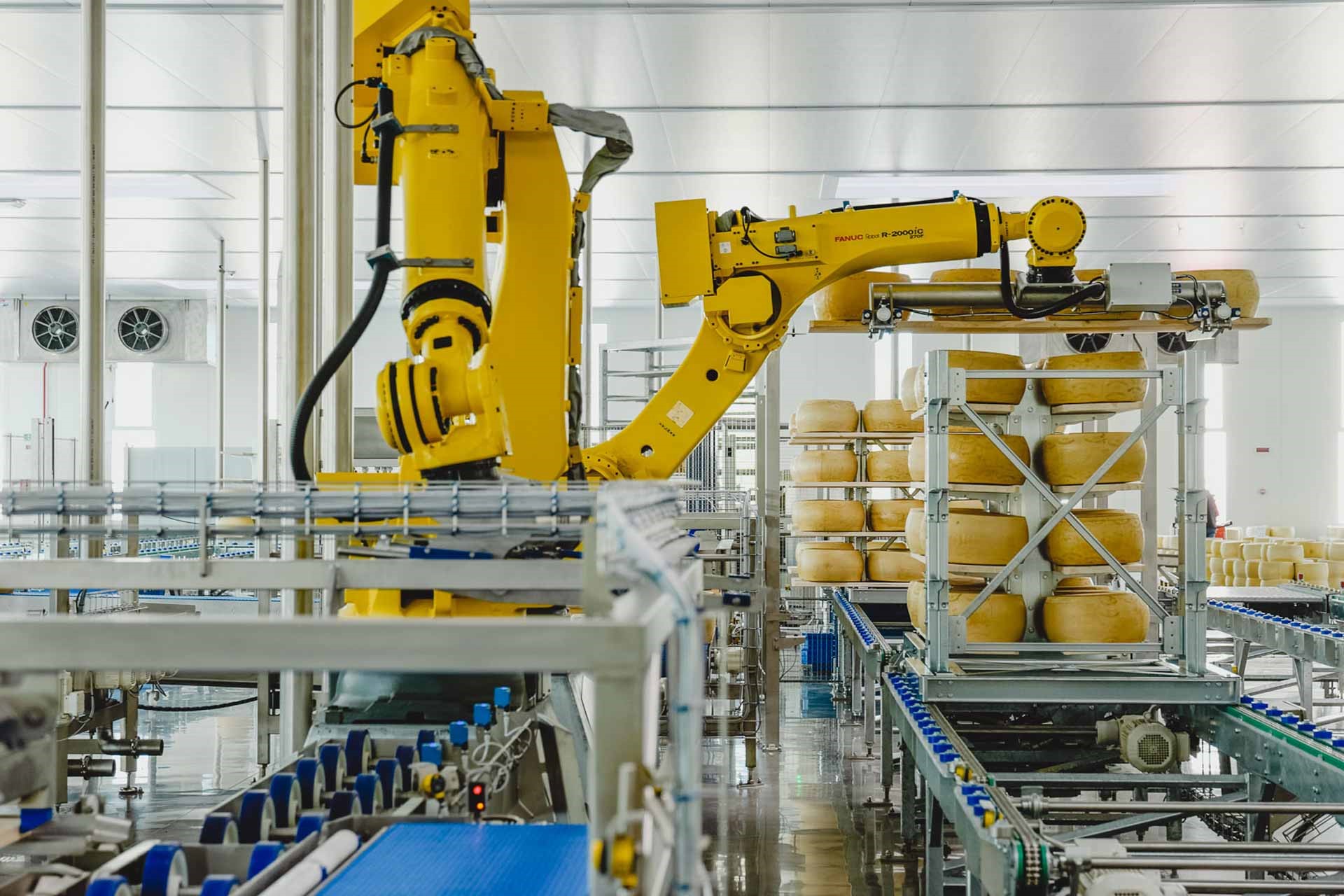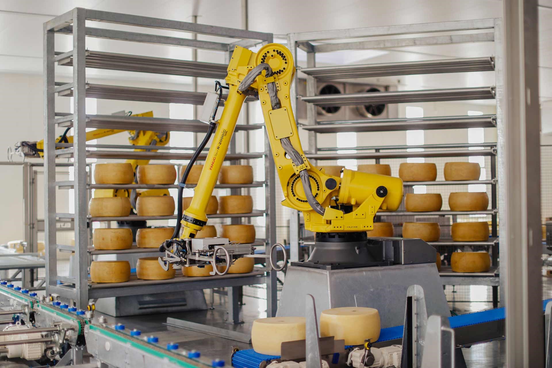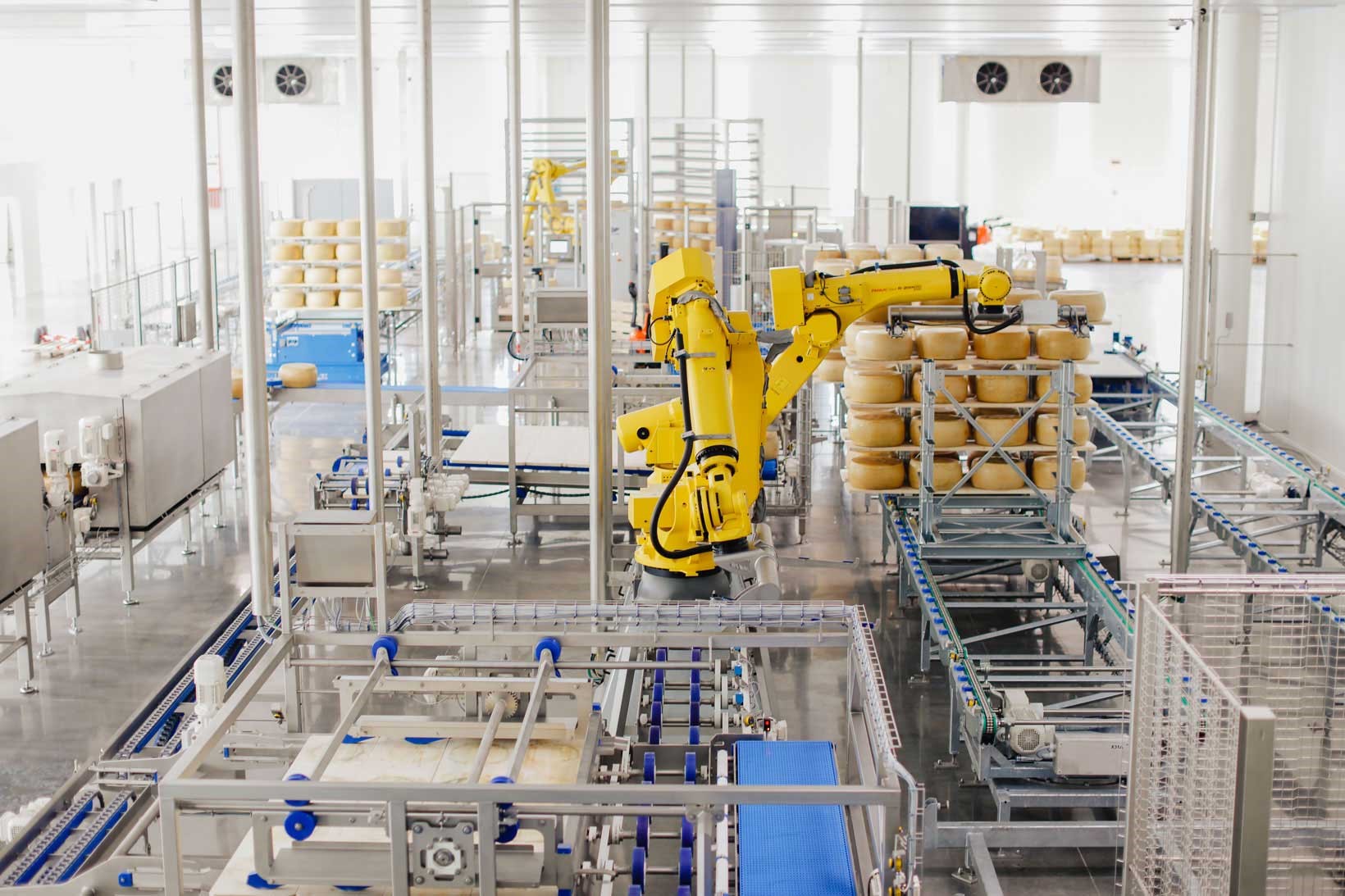 Un impianto tecnologicamente avanzato che permette di gestire in modo totalmente automatico le 800 forme di formaggio che arriveranno ogni giorno dagli stabilimenti produttivi: dalla rilevatura del peso alla verifica di eventuali forme fuori sagoma, al trasporto in magazzino, alla selezione delle forme tramite raggi X, alla separazione delle forme in 3 categorie differenti, all’imballaggio e all’applicazione etichetta. Infine, è prevista la spazzolatura e il ribaltamento delle forme, per completare il processo con la pulizia delle assi.
